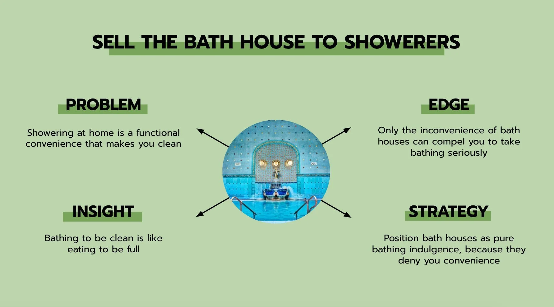 Taking daily showers is a tough behaviour to dislodge and replace with the inconvenient luxury of bath houses. Perhaps the real competitor is a similar ‘pampering’ behaviour such as massages or a staycation. Then we might think about how the indulgence of steam and water of a bathhouse might be positioned to deposition that behaviour.